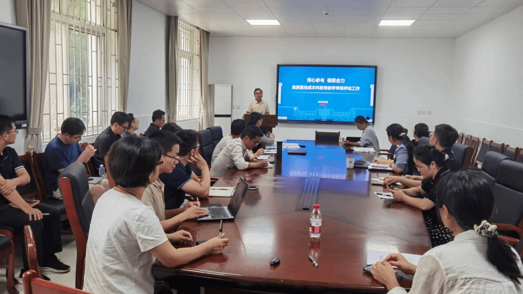 支部副书记石炜还以 “深化推动一流本科教育更高质量发展” 为题部署了本科教育教学审核评估工作。他从 “一根本(立德树人)、两突出(以本为本、四个回归)、三强化(学生中心、产出导向、持续改进)、五个度(达成度、适应度、保障度、有效度、满意度)” 四个维度,梳理了新一轮审核评估的核心要求,强调立德树人成效是检验学校一切工作的根本标准。全体教师要对照指标逐项完善教学材料,把教案、试卷、毕业论文等日常资料做细做实,以平常心迎接评估,以规范态促进提升。