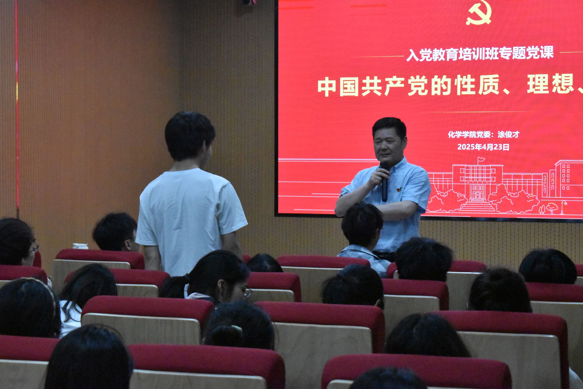 (通讯员:张金秋)4月23日晚,化学学院党委书记涂俊才在化学楼102报告厅为我院积极分子、发展对象、预备党员讲授了以“中国共产党的性质、理想、宗旨”为主题的入党教育培训班专题党课。