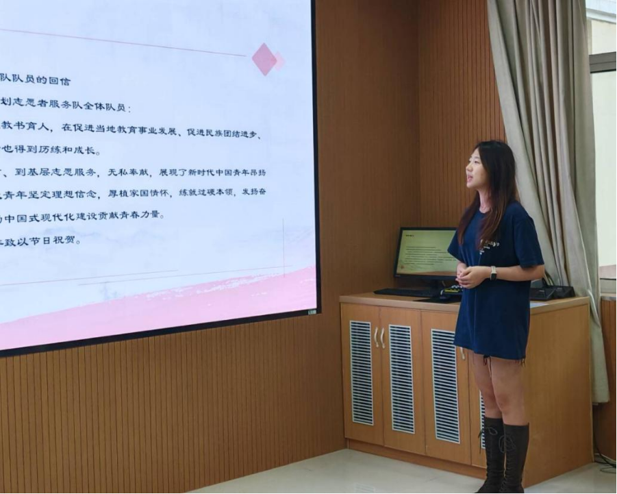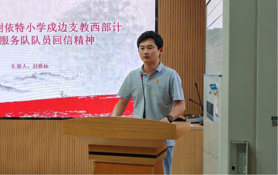随后,赵雅楠同志围绕习近平总书记给谢依特小学戍边支教西部计划志愿者服务队队员的回信精神,结合西部计划实施背景深入解读回信内涵。青年党员要培养奉献精神和服务意识,到祖国和人民最需要的地方发光发热,将个人理想融入国家发展大局。